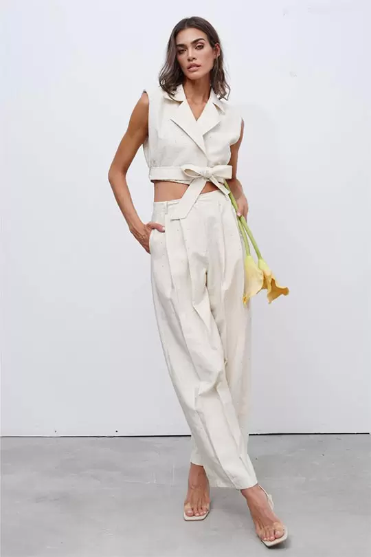 Ekru Taşlı Yüksek Bel Kemerli Yelek Pantolon Takım