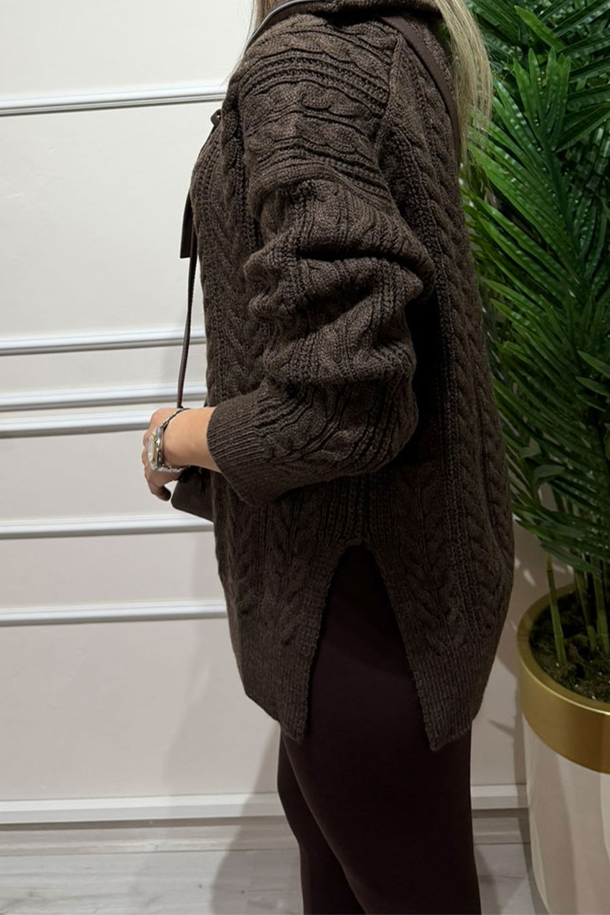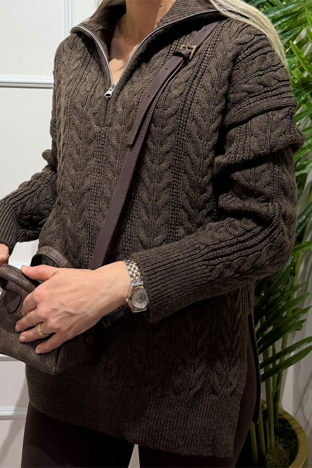 Kahve Fermuarlı Triko Kazak İki Yandan Yırtmaç Detaylı