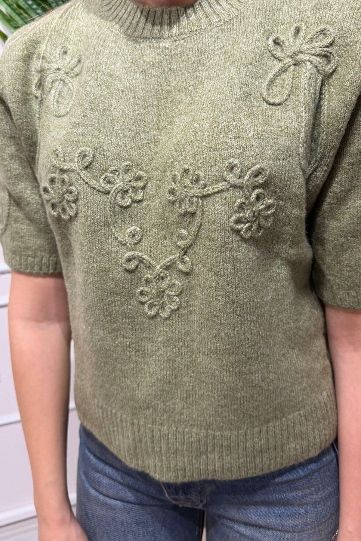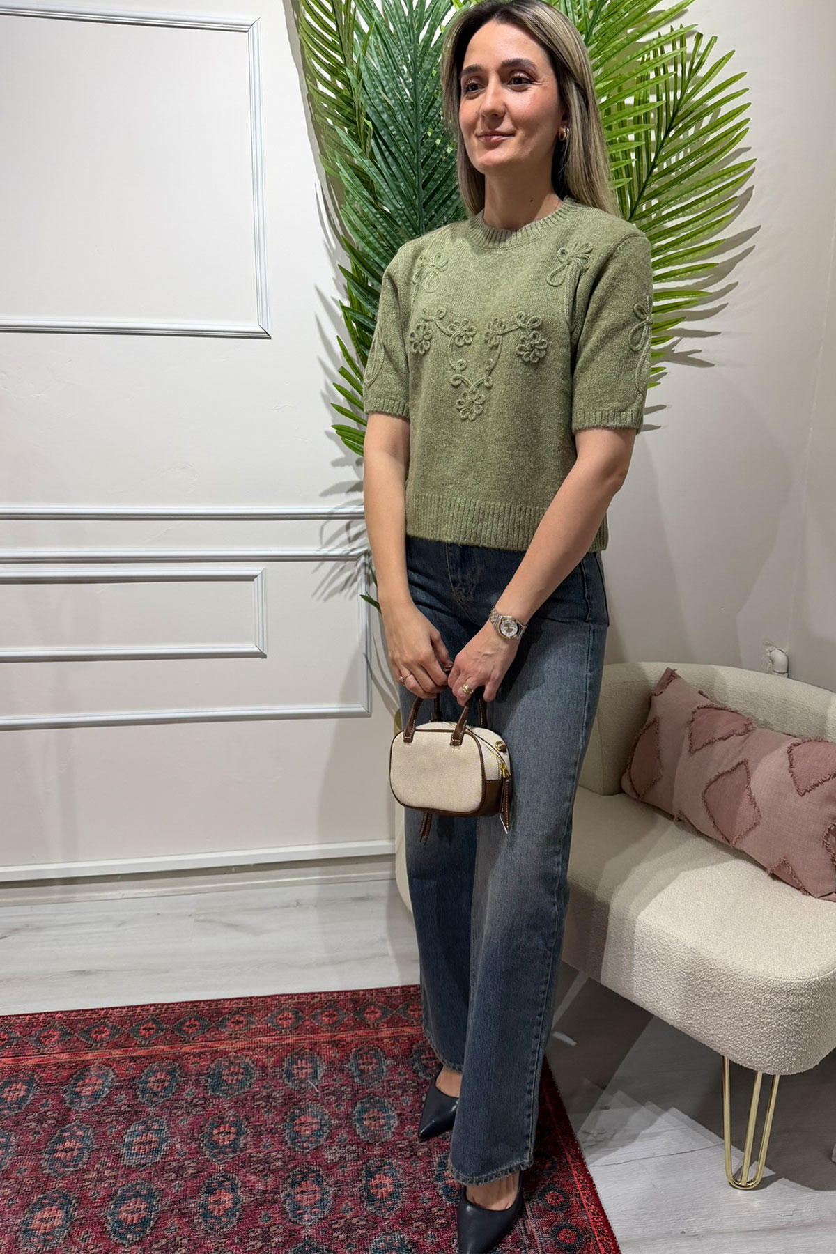 Yeşil Kısa Kollu Çicek Detaylı Triko Kazak